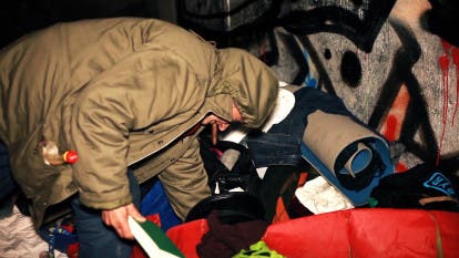 Auf seinem Schlafplatz türmen sich alte Kleidungsstücke. Auch Frauen- und Kinderkleidung liegt da herum. Er bedeckt damit die Fäkalien. „Und drunter sind auch Mäuse“, kichert Heinrich. Seine Dokumente hat er immer bei sich, in einem dunkelblauen Stoffsack.